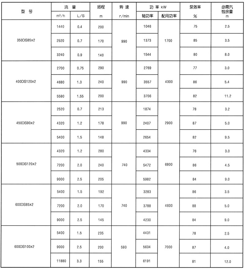 型號意義:以400DS-120×2為例 400-水泵進水口名義直徑(mm)DS一多級雙進口中開離心泵 120-水泵名義單級揚程(m) 2-水泵級數(shù)