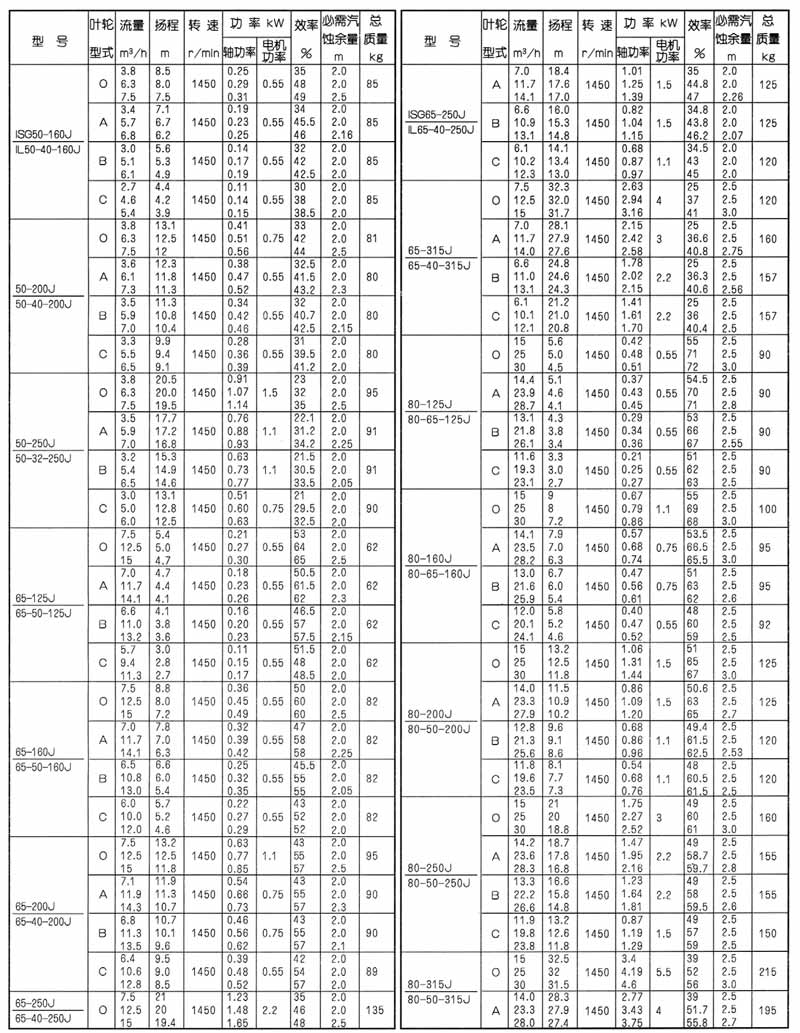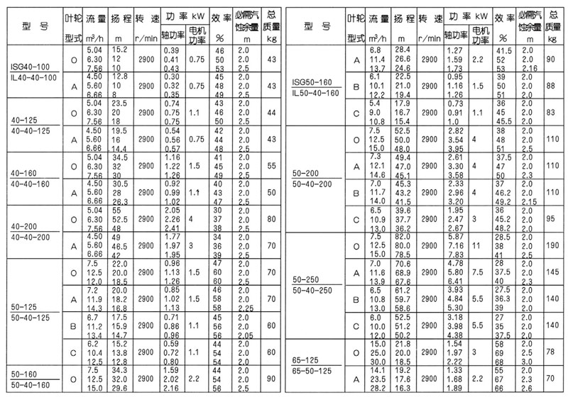 主要零件制造材料:泵體、泵蓋一鑄鐵或球墨鑄鐵;葉輪一鑄鐵或鑄銅;軸一碳鋼或不銹鋼。泵型號中數(shù)字的意義:如ISG100--200,100--進(jìn)、出口直徑(mm),200--葉輪名義直徑。IL200-150-250B,200--進(jìn)口直徑(mm),15 0--出口直徑(mm),250B—-葉輪直徑經(jīng)第二次切割。