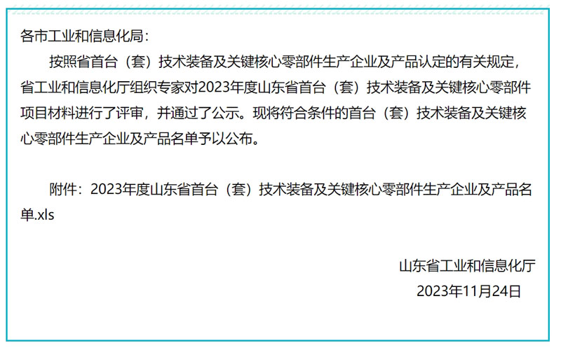 按照省首臺(套)技術(shù)裝備及關(guān)鍵核心零部件生產(chǎn)企業(yè)及產(chǎn)品認(rèn)定的有關(guān)規(guī)定,經(jīng)各市工業(yè)和信息化局推薦,專家評審等環(huán)節(jié),擬將286種產(chǎn)品列入《2023年度山東省首臺(套)技術(shù)裝備及關(guān)鍵核心零部件企業(yè)及產(chǎn)品名單》